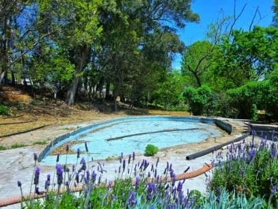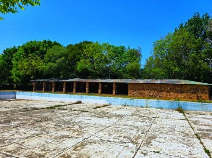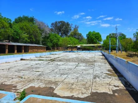 The pool compound structure contains garages, storage rooms, and/or workshops. The pool itself, an Olympic sized pool that needs some upgrading.