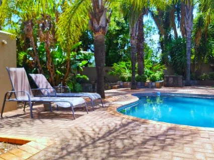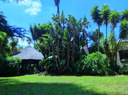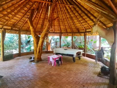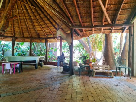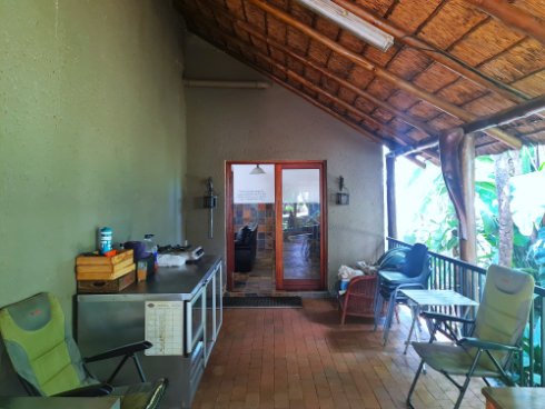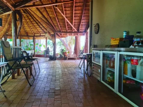 The bedroom wing: thatch covered patio looking out onto the pool area.