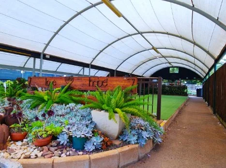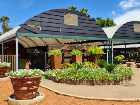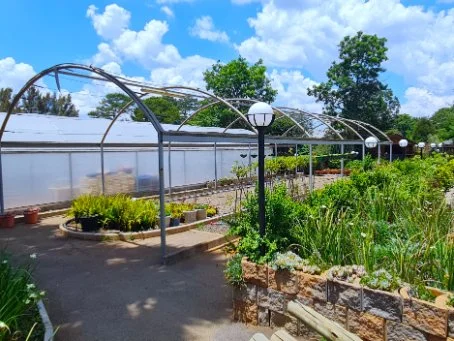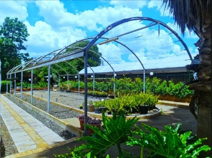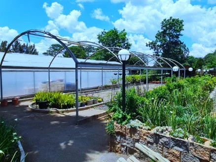 6m x 18m - solid frame uncovered tunnel - with crusher stone walkways and display beds for outdoor plants.