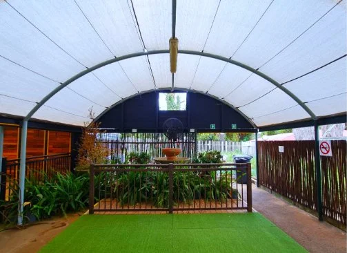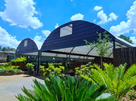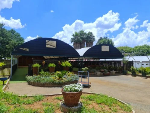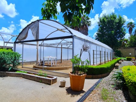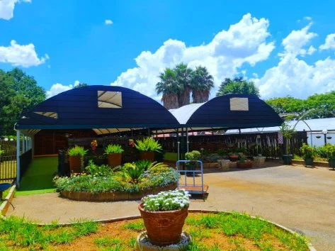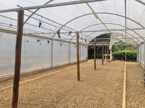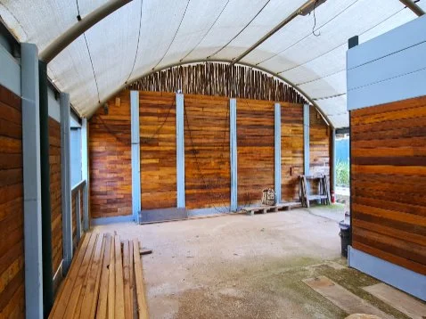 6m x 24m - Solid tunnel frame enclosed with plastic and shade net and solid wooden panels.