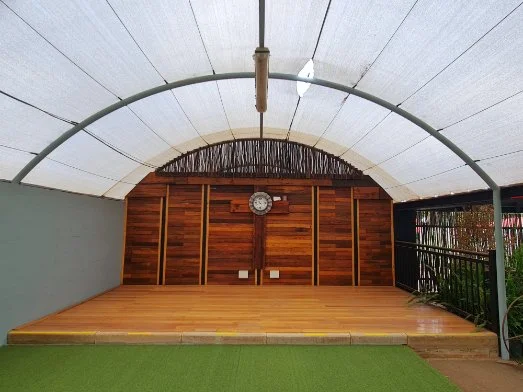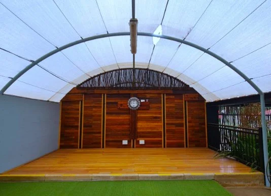 * Solid wood stage and beautiful wooden feature wall with lights for evening events.