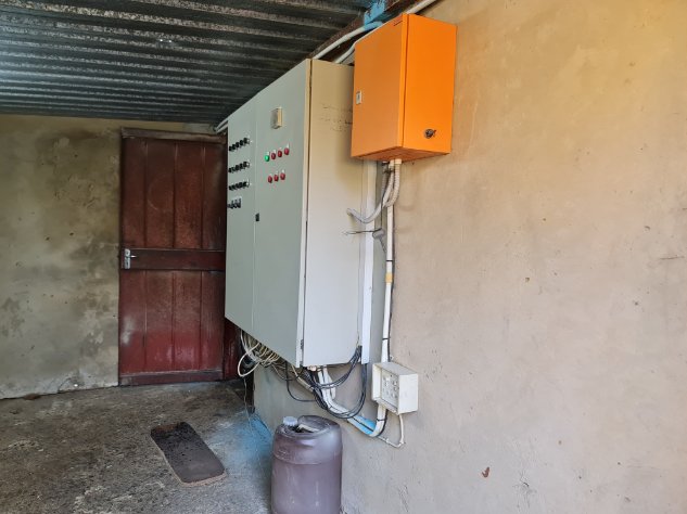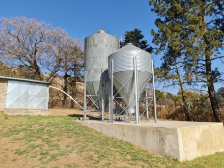 3 JOJO Tanks 10 000L each, 1 pressure pump, Supplying water to both the residential and poultry units.