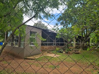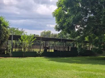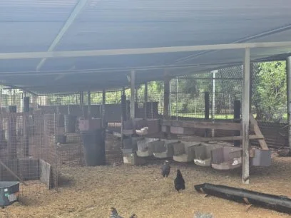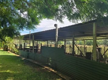 Well fenced, covered sheep kraal with 3 divisions: free range nesting boxes, cameras, spotlights, and beams.